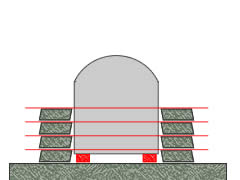 Αρχίζουμε σιγά-σιγά να προσθέτουμε πέτρες καλύπτωντας το καλούπι μας, έχωντας στο νου μας να είναι όσο το δινατόν πιο ομιόμορφη κατασκευή. Δηλαδή χρησιμοποιούμε όσο το δυνατόν ίδιες πέτρες σε διάσταση. Το χτίσιμό μας γίνεται διαδοχικά και από τις δύο πλευρές. |