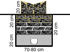 Τα θεμέλια του σπιτιού μας θα πρέπει να εισέρχονται τουλάχιστον 60 εκ κάτω απο την επιφάνεια της γης και με πλάτος όχι λιγότερο από 80 εκ, εφόσον βρούμε σκληρό υπόστρωμα και αποτελούνται απο 3 διαδοχικά στρώμα καλά συμπιεσμένα. 1ο στρώμα: χοντρό χαλίκι αποστράγγισης υδάτων 2ο στρώμα: μεγάλες πλάκε πέτρες καλά συμπιεσμένες χωρίς συνεκτικό αρμό 3ο στρώμα: μεγάλες πέτρες χτισμένες με τσιμέντο και άμμο, οι οποίες θα έχουν πλάτος αρχικά τα 80 εκ και θα καταλήγουν πάνω από την επιφάνεια στο τελικό πλάτος του τοίχου. |
