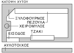 αριστερά είχε στην μέση το χειρόμυλο και στην γωνία τον ξυλόφουρνο.